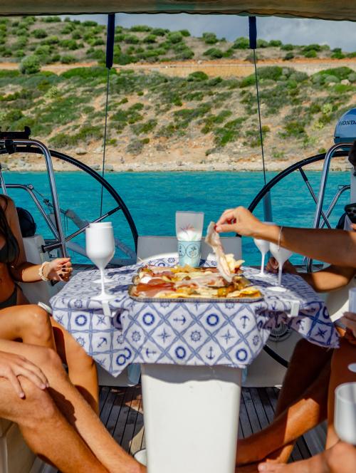 Nel frattempo, lo skipper ti offrirà un aperitivo di benvenuto con prodotti locali e vino sardo, da gustare cullato dal mare.